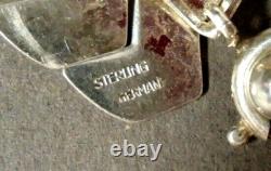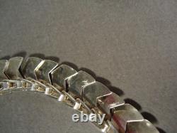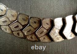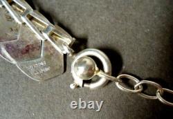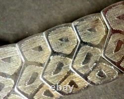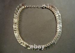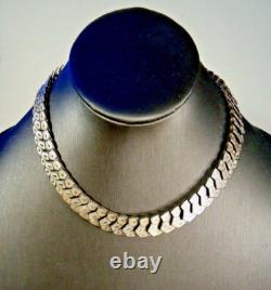 This solid (not plated) sterling silver choker necklace is adjustable from 14 inches to 15.7 inches depending on where you connect the clasp. It is 1/2 inch wide, and each link has an engraved pattern. The back of the last link is marked "STERLING" and "GERMANY".